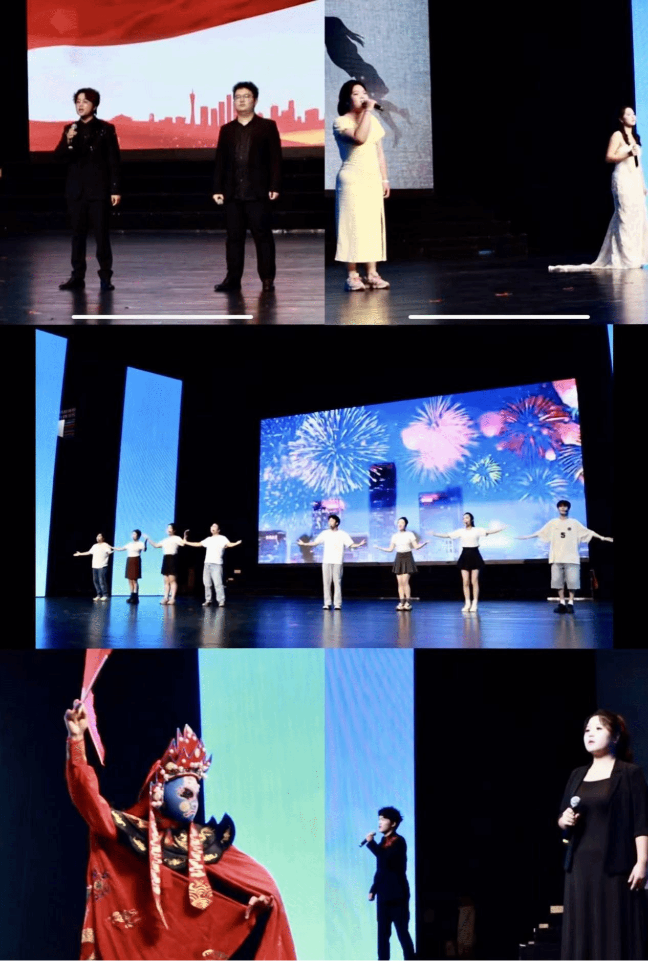 在文艺汇演环节,师生表演了合唱《我的祖国》、诗朗诵《英雄》等节目,典礼在大合唱《相亲相爱》中落幕。