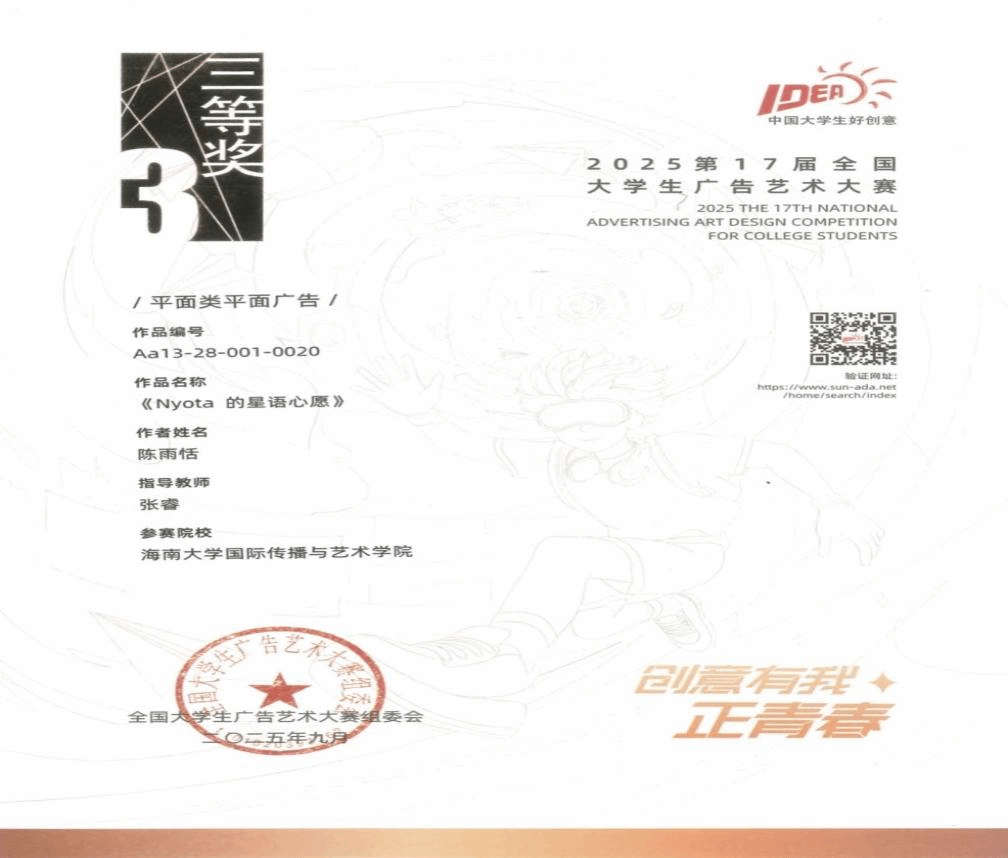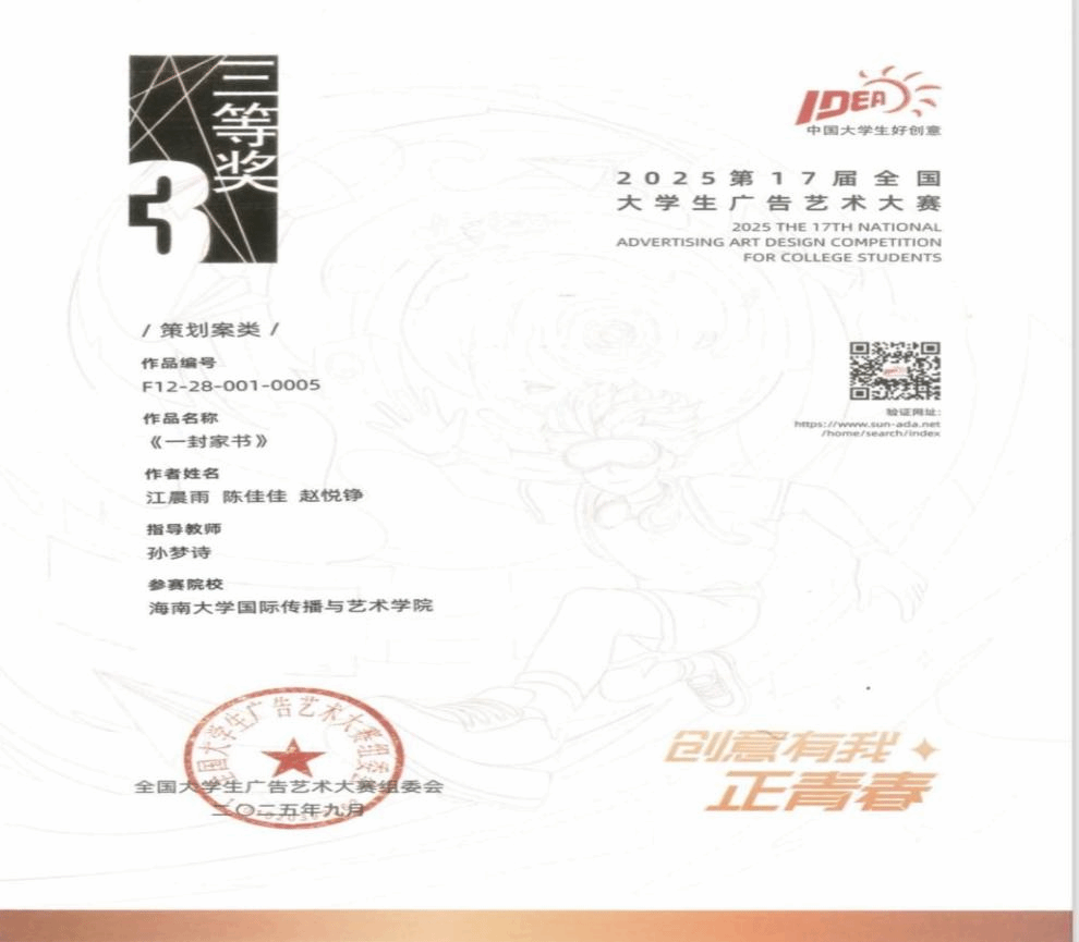 在本届大赛中,我院师生团队积极备赛、踊跃参赛,凭借扎实的专业功底与蓬勃的创造力,历经层层选拔与激烈角逐,斩获佳绩。其中,全国级奖项收获三等奖2项、优秀奖5项;省级奖项斩获一等奖6项、二等奖24项、三等奖35项,充分彰显了我院人才培养的扎实成效。同时,我院教师在赛事组织与区域推动工作中表现突出,获全国组委会高度认可—我院教师、大广赛海南赛区组委会秘书处孙梦诗,因卓越的组织协调能力被授予2025年度“优秀组织工作者”称号;我院教师、大广赛海南赛区负责人何晶娇,因在推动海南赛区成立、助力大赛走进海南高校、搭建省内外学子创意交流平台等方面的突出贡献,荣获 “最佳推动奖”,海南赛区同步获评“优秀赛区”称号。