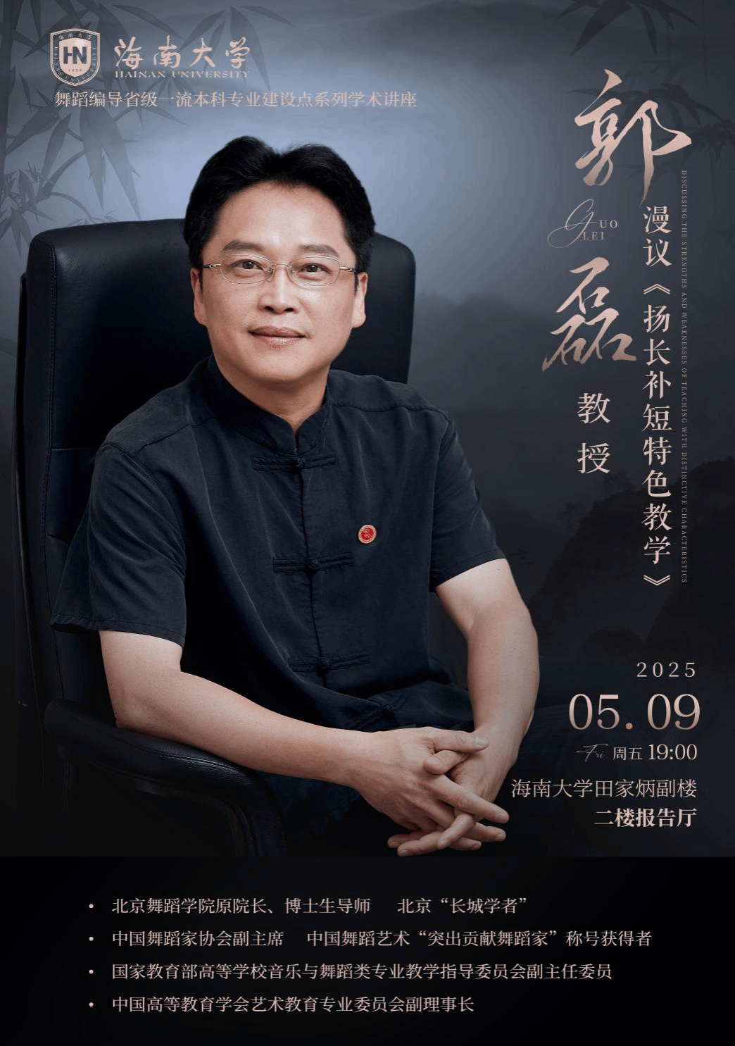 本次讲座以《扬长补短特色教学》为主题,郭磊教授结合40余年教学与创作经验,提出“强化优势、突破短板”的育人理念。他强调,舞蹈编导教育需立足本土文化,通过传统技法精研与现代思维融合双轨并进,形成“扎根地域、对话时代”的特色教学模式。针对教材建设,他建议强化系统性、风格辨识度与训练价值,注重从素材到教材的转化。