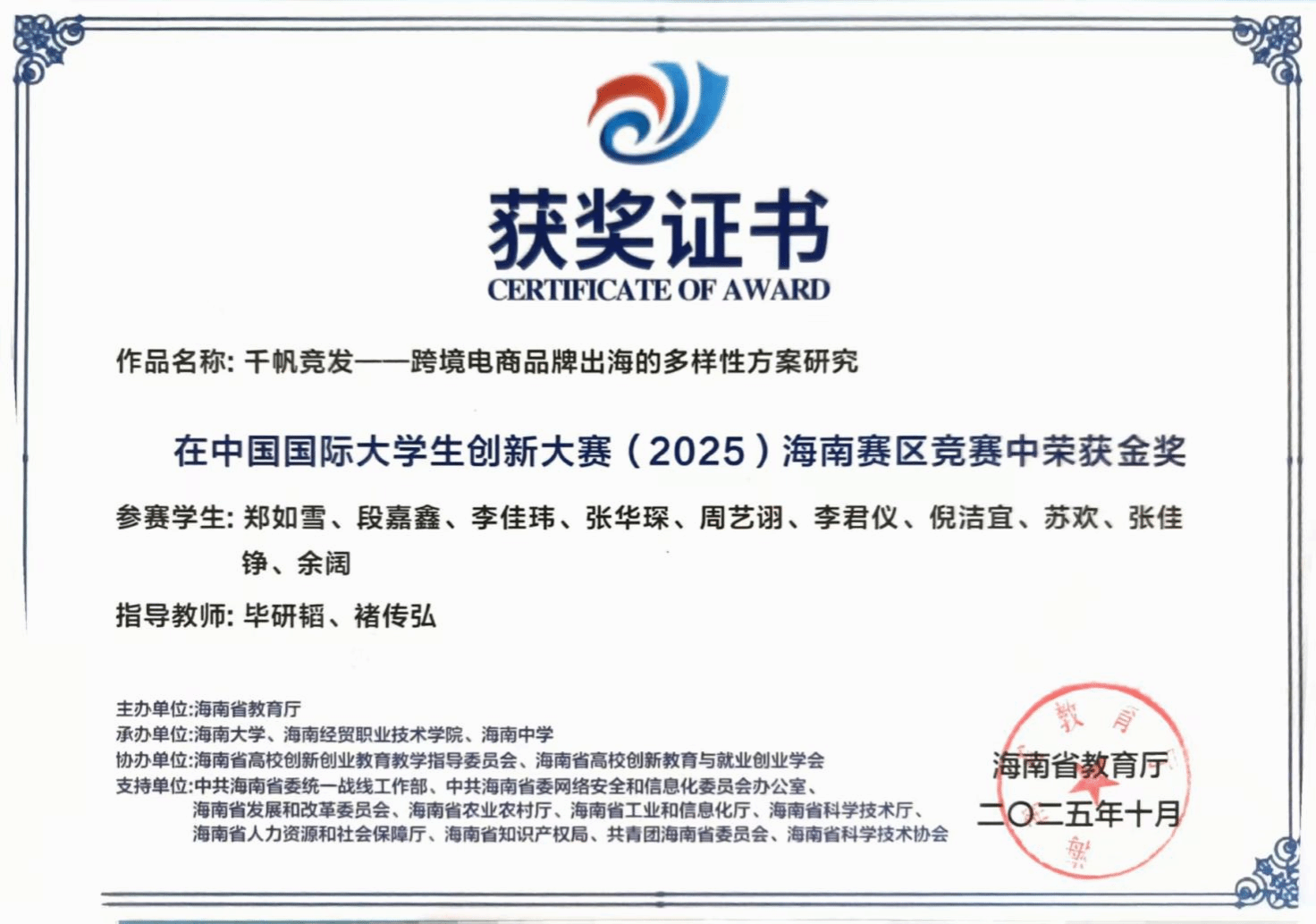 近日,中国国际大学生创新大赛(2025)海南赛区获奖名单公布,我院传播学系2023级本科生郑如雪带领的团队,凭借作品《千帆竞发——跨境电商品牌出海多样性方案研究》荣获金奖,该项目指导老师毕研韬、褚传弘被评为“优秀指导教师”。