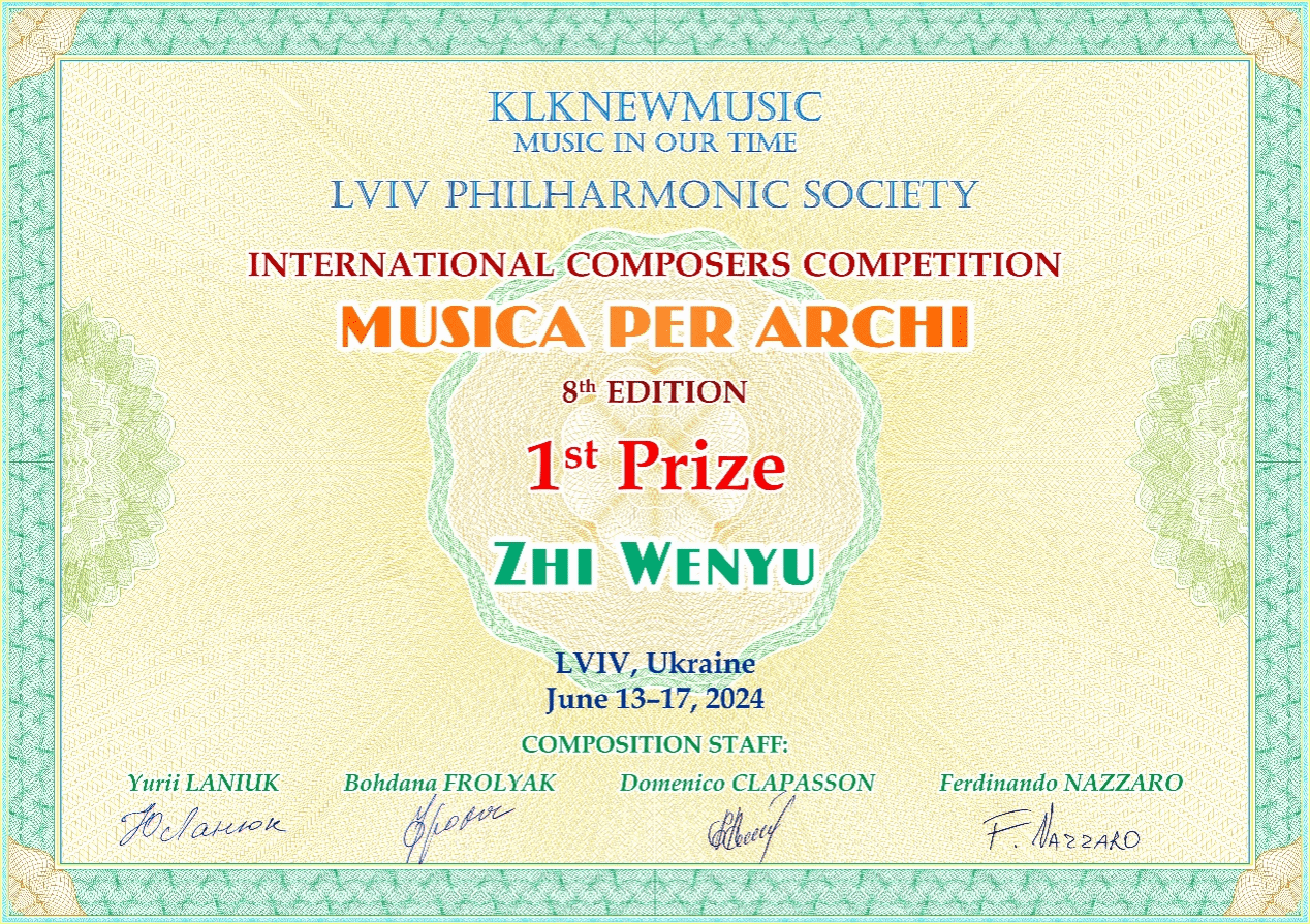 6月17日晚,第八届“Musica per archi”国际作曲比赛决赛音乐会在乌克兰利沃夫爱乐音乐厅圆满落幕,我院青年教师智文禹凭借作品《Breath of the rain forest》(雨林之息)荣获一等奖。