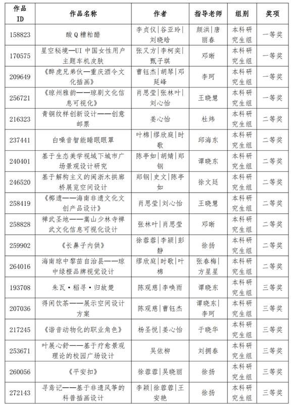 这些优秀成绩的取得,彰显了我院在设计教育领域的学科实力与对创新教学实践的不懈追求。持续创新教学方法和手段,为学生提供更优质的设计教育,同时也有利于激发学生的学习热情和创新潜能,鼓励其积极参与到各种设计实践活动中,不断提升设计能力和综合素质,为海南自由贸易港的文化建设和设计事业添砖加瓦,用专业才能在设计领域绽放光彩。