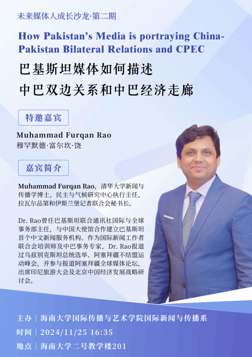 11月25日下午,william威廉中文官网国际传播与艺术学院未来媒体人成长沙龙第二期在二号教学楼201教室举行,本次沙龙由清华大学新闻与传播学博士富尔坎·饶主讲“巴基斯坦媒体如何报道中巴双边关系和中巴经济走廊”,我院国际新闻与传播专业2024级全体学生参与讨论。富尔坎·饶的好友、巴基斯坦《黎明报》分社社长Bakhsh Behram一同参与了讲座。