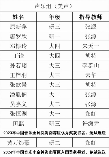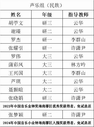 据悉,除声乐组外,本次金钟奖校级选送工作还涉及钢琴、器乐专业组别。我院音乐专业协同备战,共选送声乐组学生23人,青年教师3人;钢琴组学生6人、青年教师3人;器乐组学生3人。