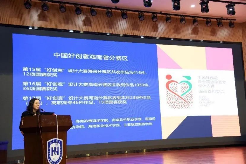海南省赛区组委会主任唐丽春教授总结了近几届海南省赛区在中国好创意国赛的获奖情况,可见在国赛中硕果累累,离不开同学们对设计的热忱。同时唐教授指出此项比赛不仅为参赛者提供了一个展示和交流的绝佳平台,而且大大提高了同学们的设计积极性。
